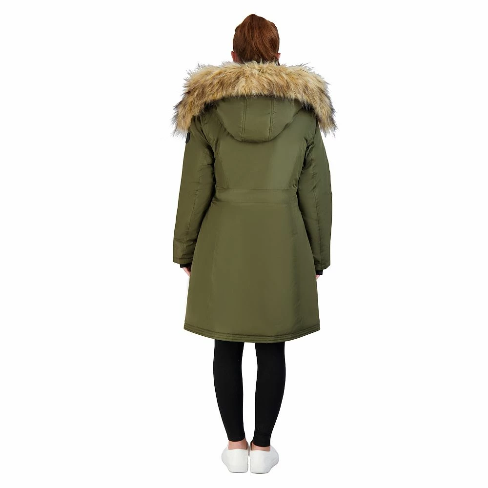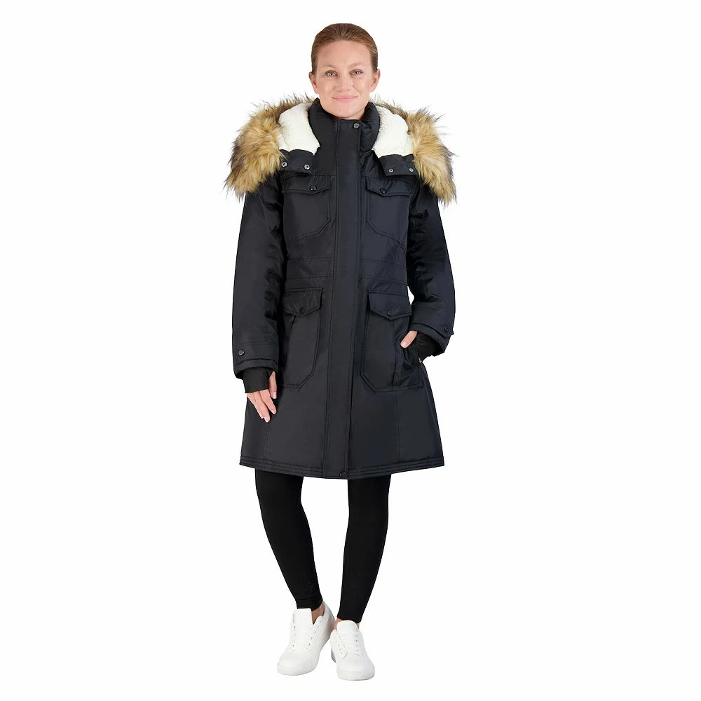- Attached hood with removable faux-fur trim