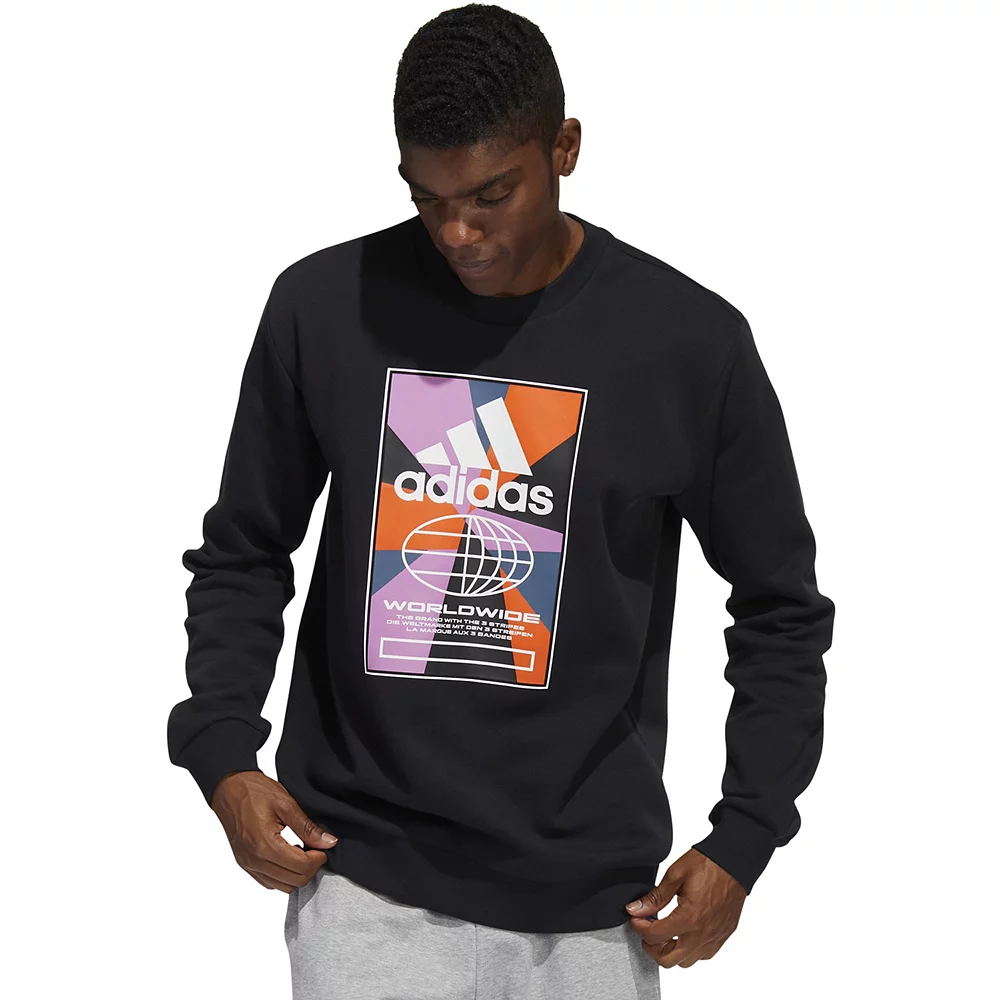 Designed for adidas fans everywhere. This bold men’s sweatshirt is printed with a ‘worldwide’ graphic. With its cozy fleece interior, it’ll be a welcome addition to your winter wardrobe, pairing easily with anything from bright running shoes to combat boots.