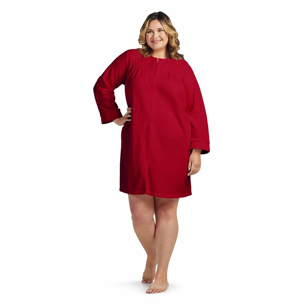 Featuring a cozy brushed-back Terry construction, this women’s short snap robe from Miss Elaine Essentials will have you lounging in complete luxury.