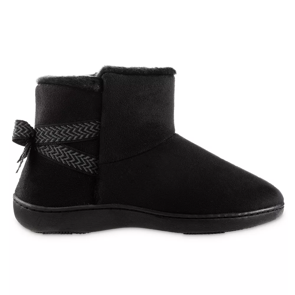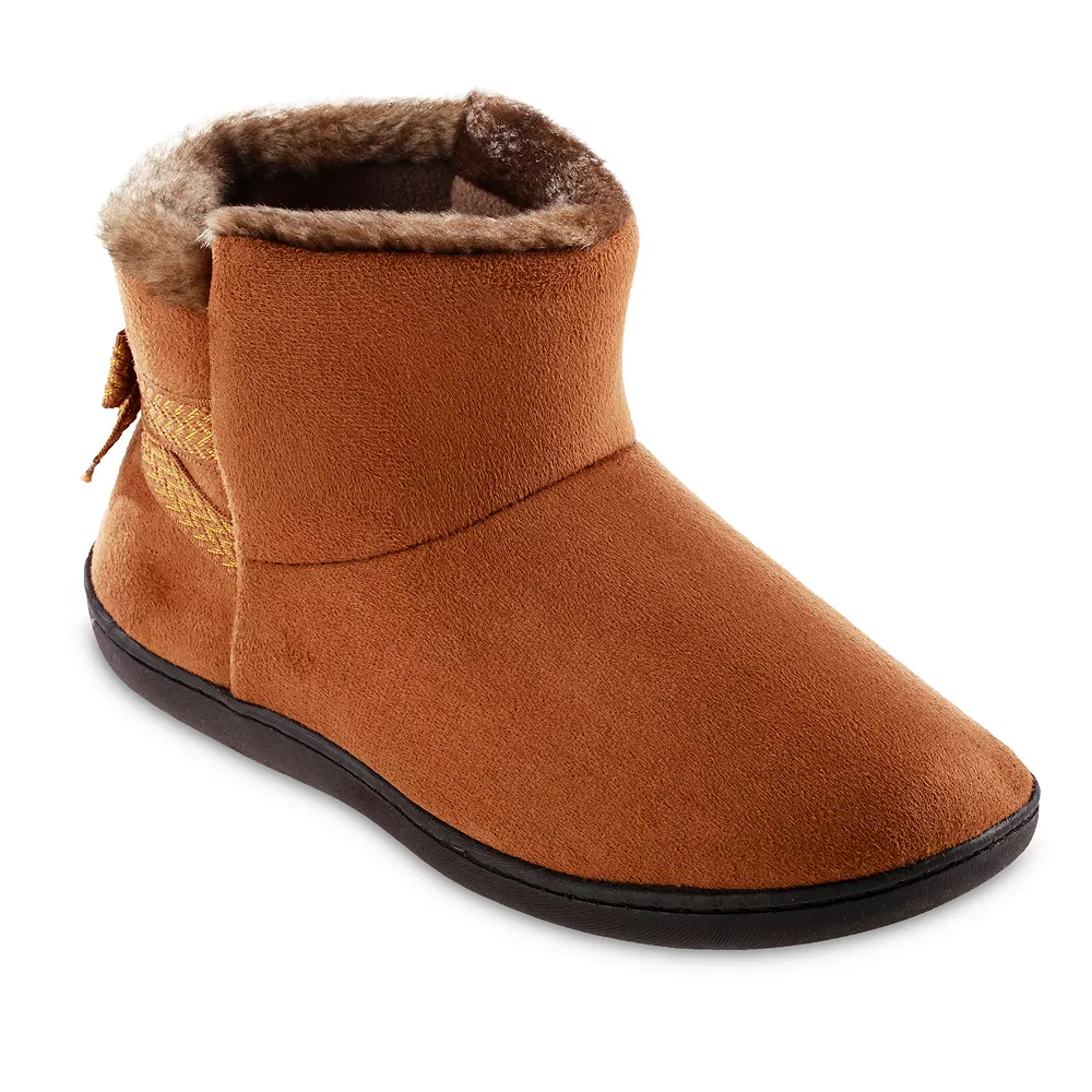 These isotoner microsuede boot slippers with feature isotoner 360 Surround Comfort, and are made with warm fleece lining and soft neutral uppers for comfort and long-lasting durability.
