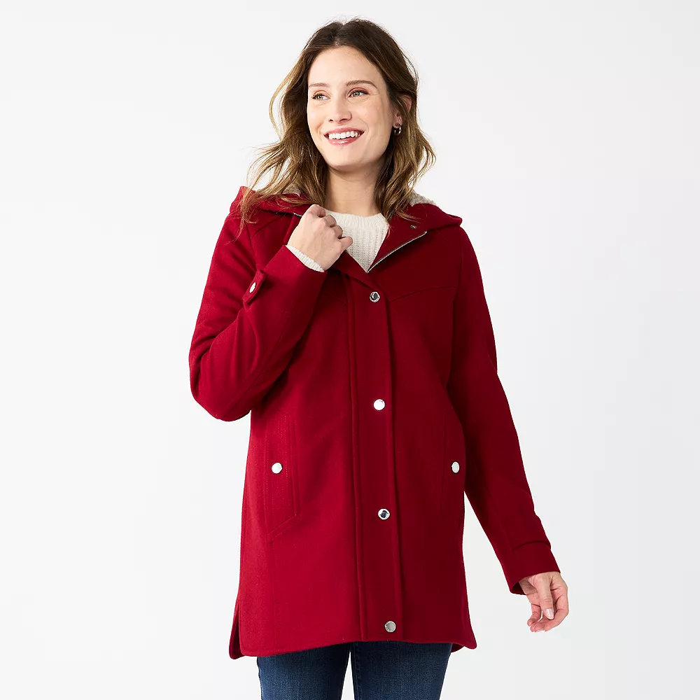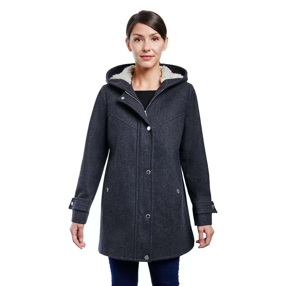 Upgrade your winter wardrobe with this women’s London Fog sherpa hooded wool-blend coat.