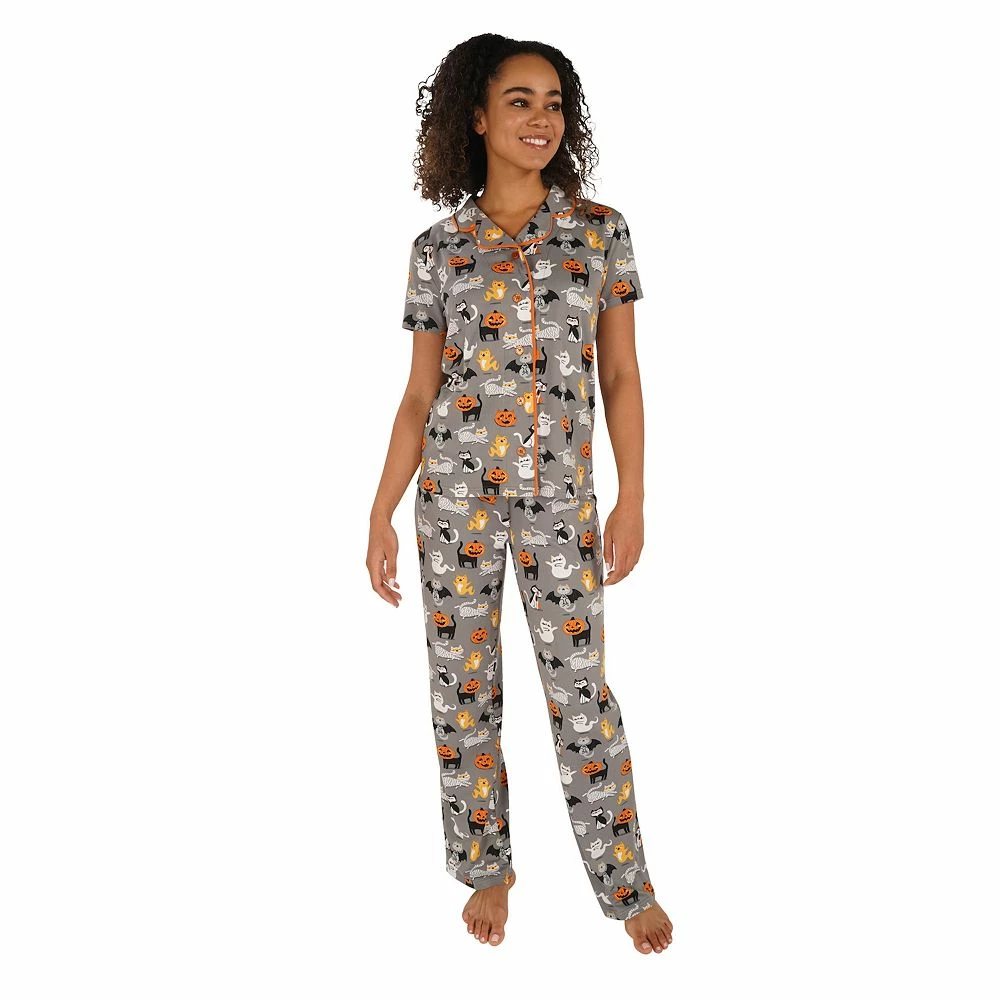 Boo! Be frightfully festive when you wear this women’s Nite Nite by Munki Munki Halloween graphic pajama set. Comes with a long sleeve button down top and soft, jersey construction pants.