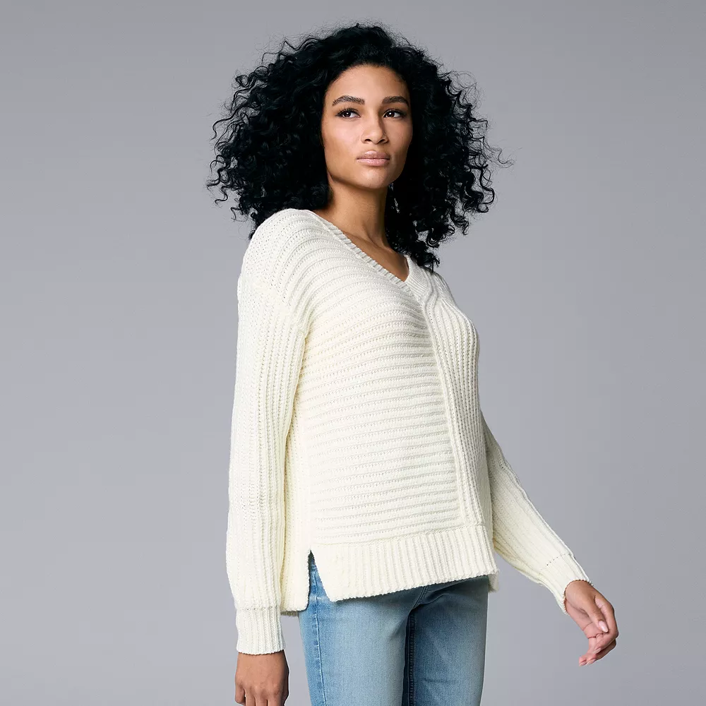 Upgrade your winter wardrobe with this women’s ribbed v-neck sweater from Simply Vera Vera Wang.